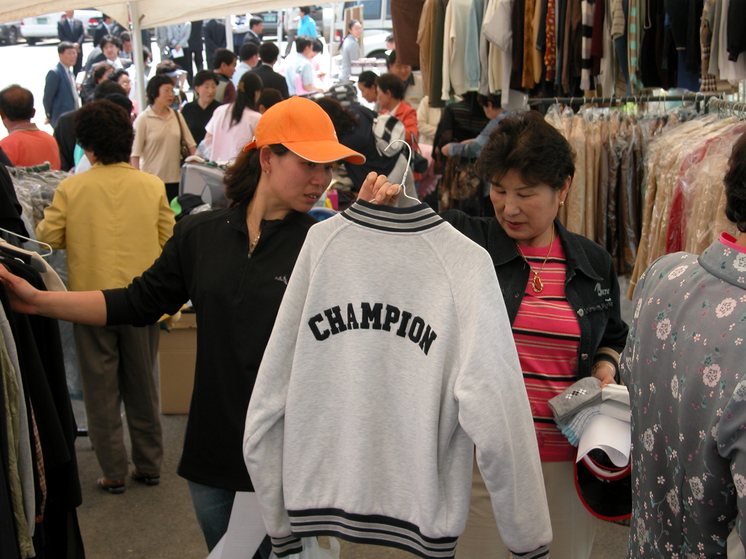 바자회소식을 듣고 오신 인근 주민 여러분들이 값싸고 질 좋은 옷을 고르고 있습니다.