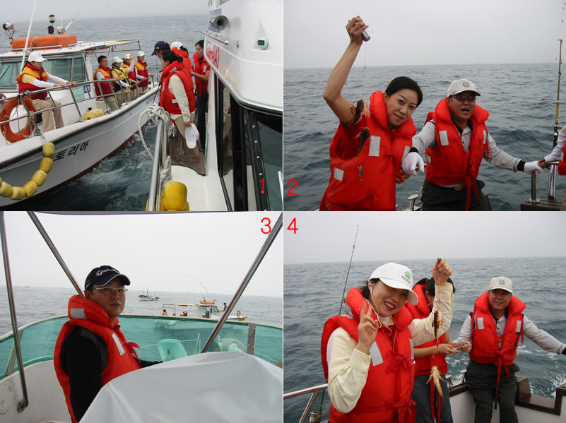 1. 서로 격려하며 파이팅을 하는 직원들. 2. 오랜시간 끝에 걸린 물고기. 3. 선장이라도 된듯. 4. 이쁜 물고기를 낚은 캐디.