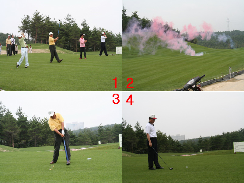 1) 시타샷을 날리며.. 2) 시타공은 궤도를 그리며 멀리 날아갔다. 3) 김재봉 회장의 멋진 티샷 4) 청평 하영호 부원장은 페어웨이를 읽고 있다.