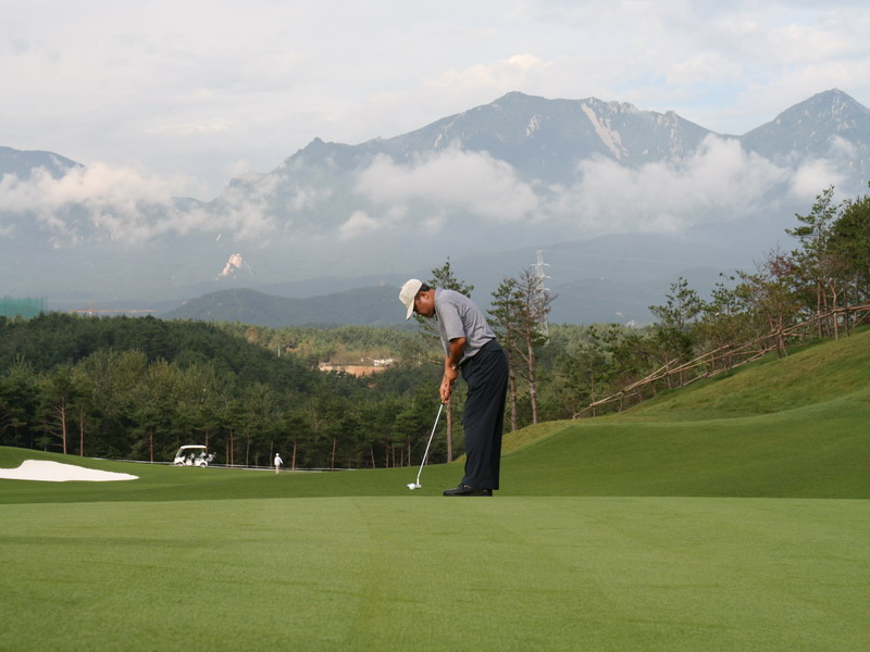김재봉 회장의 퍼팅모습. 멀리보이는 설악산의 배경이 웅장하다.