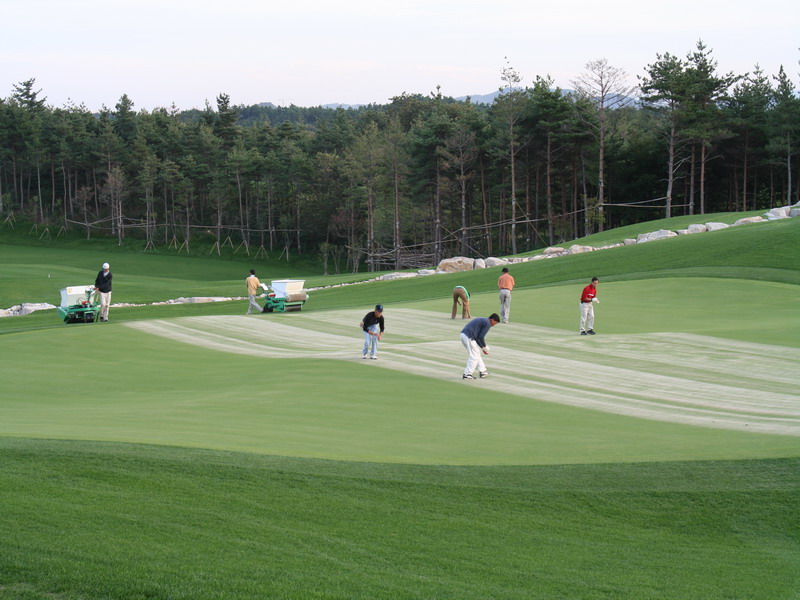 ![]() 9번홀 그린의 배토작업 모습. 배토는 잔디의 생장점을 보호하고 답압(인위적으로 가해지는 물리적 압력)에 대한 잔디 보호 효과를 가지며, 성장 발육을 도와 밀도를 높이는 작용을 한다. 파인리즈 C.C는 전코스에 이러한 작업을 주기적으로 하고있으며, 최상의 잔디조성으로 회원 분들의 만족도를 높이는데 심혈을 기울이고 있습니다. |