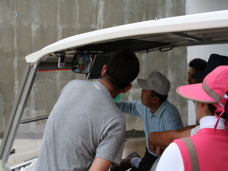 GPS SYSTEM에 대한 설명을 듣고있는 김재봉 회장. 첨단 장비인 GPS를 도입함에 따라 경기 운영과 골프 코스에 대한 정확한 제원 및 정보를 제공할 수 있게 되었다. 현재 GPS는 테스트 중에 있으며 보다 보다 완벽하게 고객들에게 선보일 것이다.