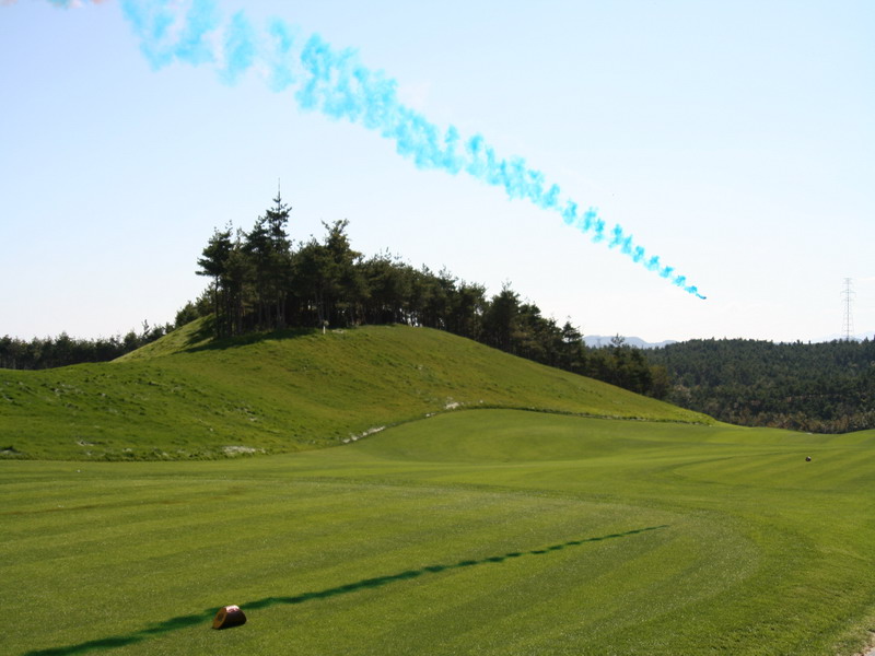 VIP초청 시범 라운드의 시작을 알리는 김재봉 회장의 시타구가 멀리 날아가고있다.