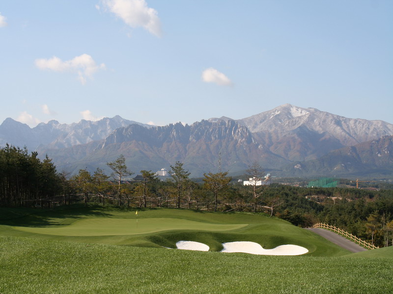 4번홀에서 보이는 눈덮힌 울산 바위와 설악의 모습