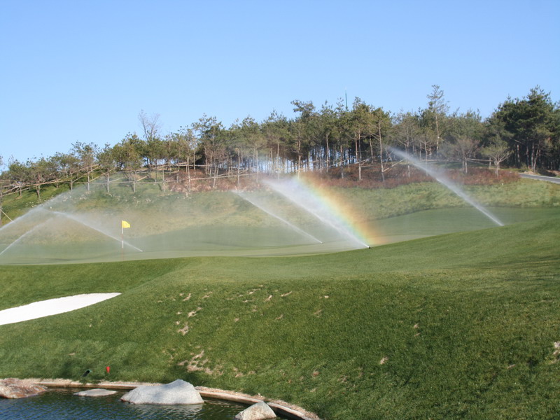 스프링클러에서 뽐어져 나오는 물줄기에 무지개가 내려 앉았다.
