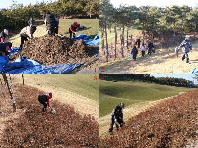 ![]() 1. 파쇄목을 담고 있는 모습 2. 추운날에도 수고하고 있습니다. 3, 4. 연산홍에 파쇄목을 덮고 있는 모습 코스관리팀은 코스주변에 심어놓은 연산홍을 보호하기 위해 파쇄목을 덮어주고 있습니다. 파쇄목은 공사 중에 나온 필요 없는 목재를 잘개 부수어 재활용하는 것으로써. 겨울철 보온효과와 습기의 증발을 막고 동결 되는 것을 방지합니다. |