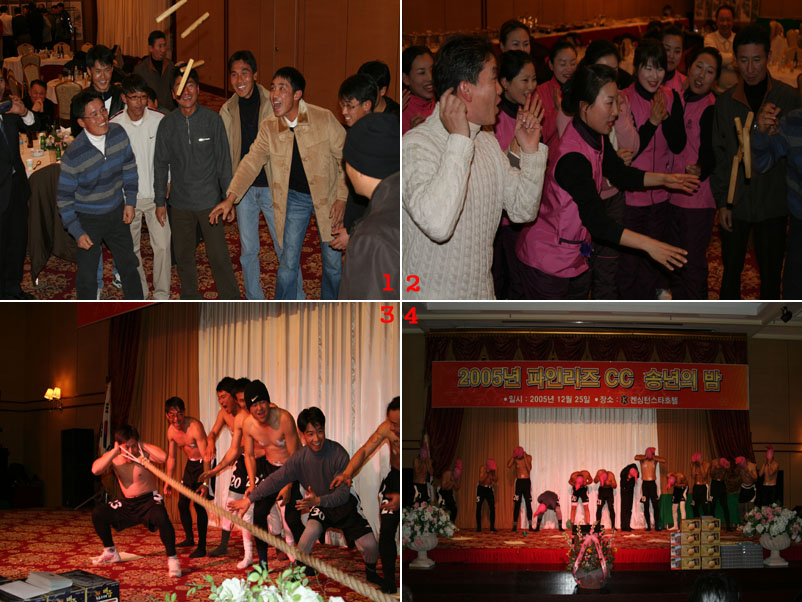 ![]() 1. 우승을 기원하는 마음으로 이길수 있다. 아자! 나와랏. 2. 우승은 우리 캐디들의 것. 질 수 없다. 3. 인내와 끈기로 무거운 중장비도 거리낌 없다. 귀로 포크레인 끌기. 4. 열정적인 무대를 선보인 코스관리팀에게 열화와 같은 박수를.. 2005년 송년의 밤에서는 여러 이벤트가 있었습니다. 커다란 상금을 이 걸린 윳놀이에서는 모두들 우승의 기원이 섞인 열띤 응원들을 하였 고, 서로를 견재하며 승부를 겨루었습니다. 진팀은 이긴팀을 응원하였고, 이긴팀은 진팀을 위로하는 멋진 스포츠맨쉽을 보여 또한 파인리즈C.C 최고의 맴버들이 모인 코스관리부에서는 이번 송년의 밤을 대비하여