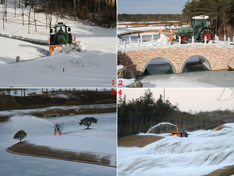 ![]() 1, 2. 카트로의 눈을 치우는 제설차량 3. 아일랜드홀 그린의 눈을 치우고 있다. 4. 페어웨이 눈을 치우고 있다. 파인리즈C.C 코스관리부는 눈 덮인 코스의 눈을 치우는 제설 작업을 하고 있습니다. 하루라도 빨리 고객들을 맞이하고 라운드 하는데 불편함이 없도록 만반의 준비를 하고 있기에 파인리즈C.C의 코스는 항상 최고의 상태를 유지하고 있습니다. 철저한 준비와 투철한 서비스 정신은 명문 골프장에서만 느낄 수 있는 것입니다. |