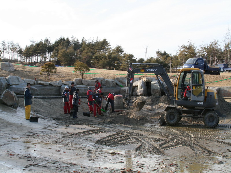 지난 가을에 채워지지 않았던 호수를 맥반석 7,000t을 설치하는 공사가 완료됨에 따라 깨끗한 호수를 고객에게 선사하게 되었다. 잔디 상태뿐만 아니라 호수도 코스의 중요한 일부이기 때문에 깨끗함을 유지하기 위해 약석인 맥반석을 깔고 마무리 청소를 하고 있습니다. |
