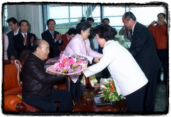 ◈ 천주평화연합 창설자이신 문선명, 한학자 총재님 양위분께 김재봉 회장 내외분이 꽃다발을 증정하는 모습. ◈ 김재봉 회장의 브리핑을 받고 계시는 천주평화연합 총재님 양위분