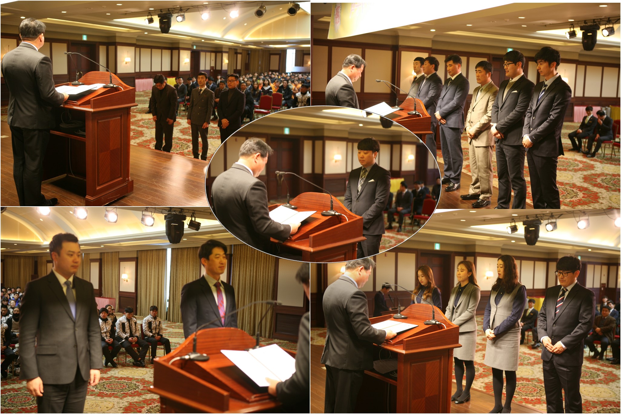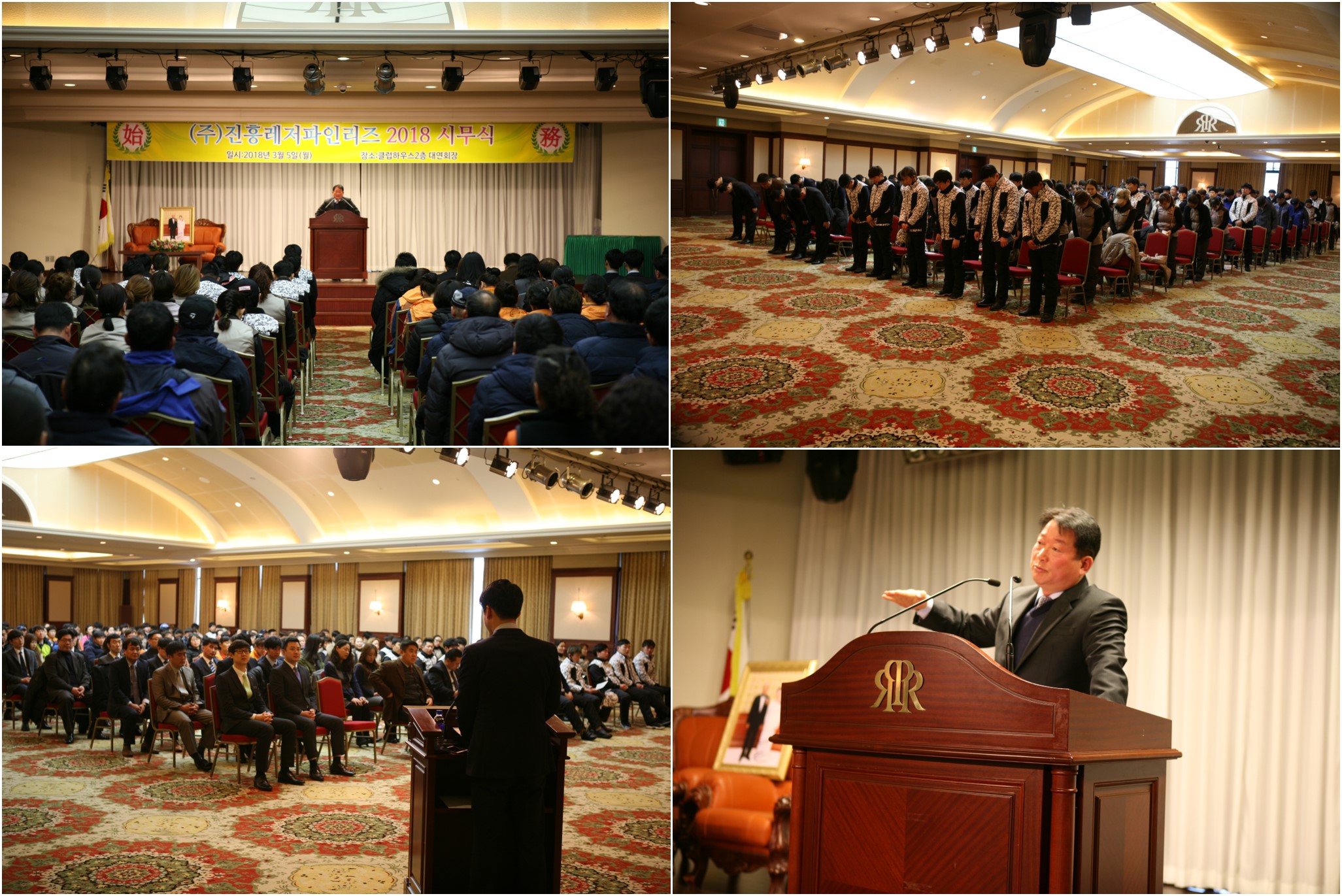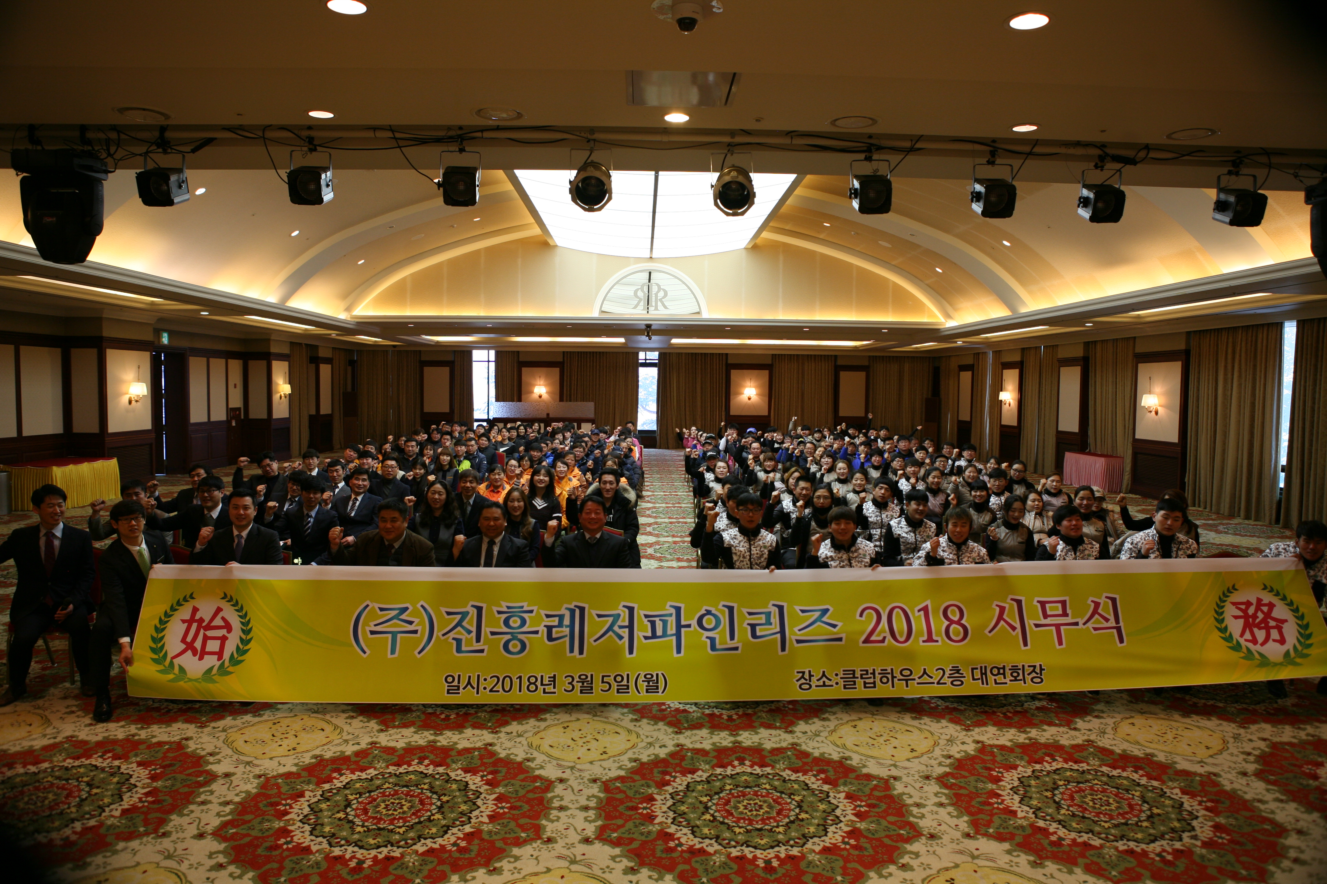 3월5일 눈이 많이 내린 아침 아름다운 설경을 배경으로 한해를 힘차게 시작하는 시무식이 있었습니다. 파인리즈, (주)팜스코, 캐디 등 약 200명의 직원이 모여 2018년도 승리의 한해가 되길 다짐하였습니다. 경영지원팀 김형탁 팀장의 개회선언을 시작으로 상장수여가 있었습니다. 신메뉴 개발 요리 경진대회에서 3명의 입상자 수상자 있었으며 (최우수상: 이광섭 과장 (황제짬뽕), 우수상: 최창호 주임 (소고기두부전골) 이병규주임 (소고기짜장) 이어 응급상황처리상의 객실프론트 함정수계장 끝으로 진급자 임명식이 진행되었습니다.
