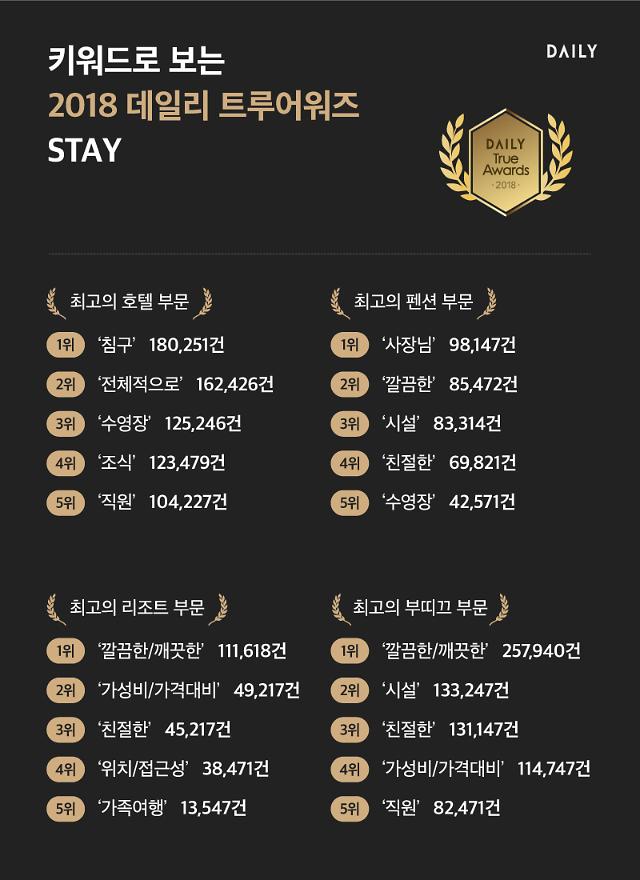데일리호텔, 고객이 뽑은 최고의 스테이는..? [뉴스발취_파이낸셜뉴스 2018-1-20] 호텔&레스토랑 예약 앱 데일리호텔은 자체 고객 리뷰 시스템인 ‘트루리뷰’의 고객 후기 데이터 150만개를 분석, 국내 최대 규모 호텔&레스토랑 어워즈인 ‘2018 트루어워즈'를 론칭하고 스테이와 고메 부분별 수상 업체를 발표했다. 트루 어워즈는 크게 스테이와 고메 부문으로 나뉜다. <최고의 스테이>는 호텔, 펜션, 리조트와 부띠끄 호텔 등 스테이 유형별로 가장 높은 만족도를 기록한 곳을 선정하였으며, <최고의 고메> 부문 역시 뷔페와 레스토랑 등 유형별로 가장 높은 평점을 받은 곳을 선정했다.