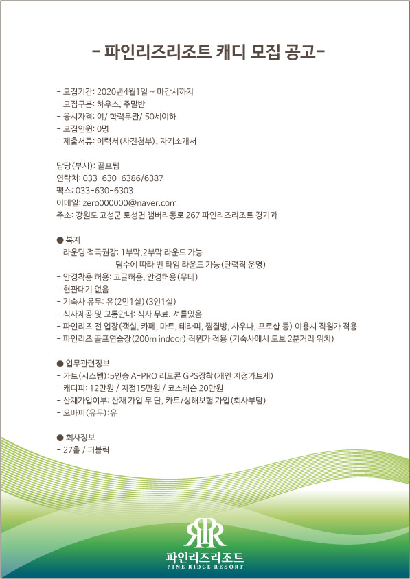 파인리즈리조트 캐디 모집 공고