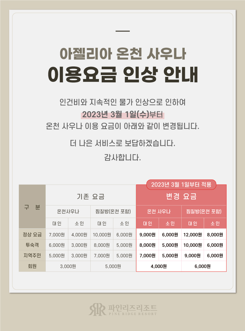 아젤리아 온천사우나 이용요금 인상 안내
