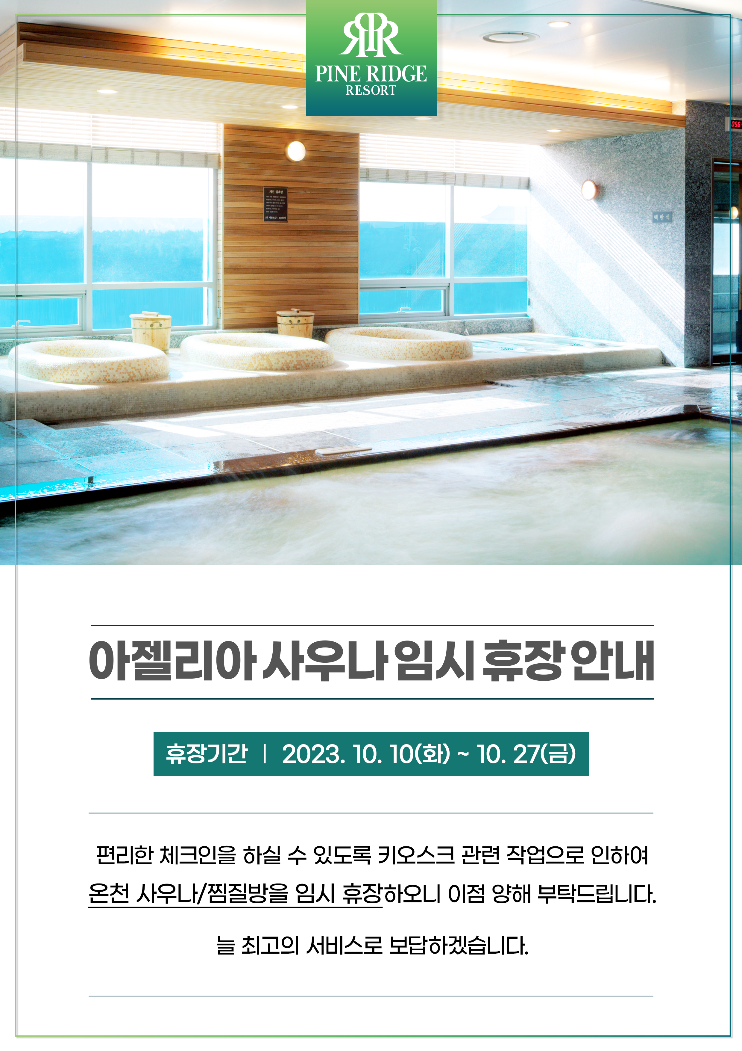 [안내] 아젤리아 온천 사우나 임시 휴장 안내 (10.10~27)