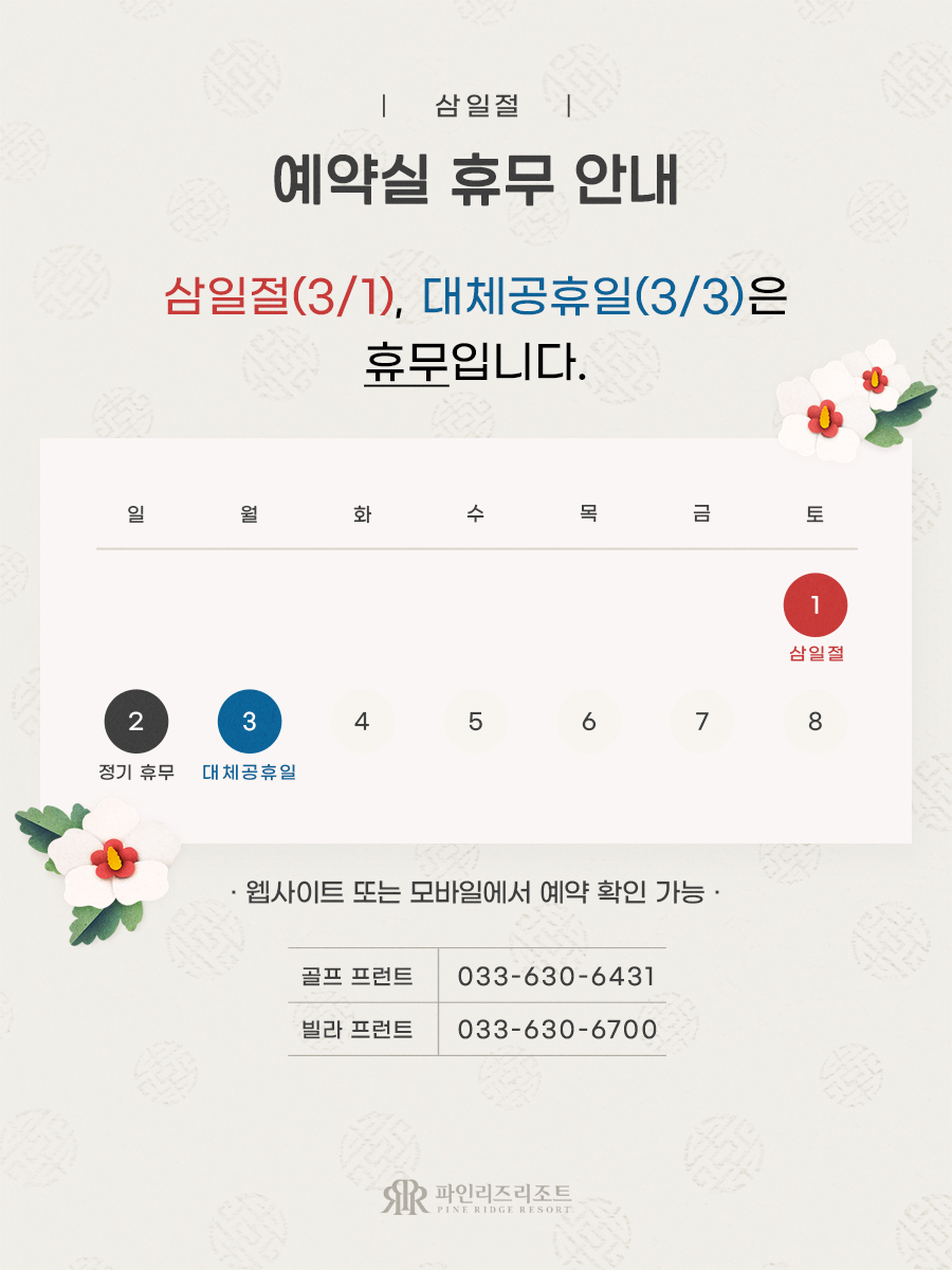 [안내] 삼일절(3/1~3/3) 예약실 휴무 안내